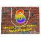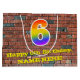 Denna pulserande och färgstarka födelsedagskalkens presentsäck, inspirerad av stadskonst och graffiti, har ett stort nummer "6" med en regnbågsspektralgradient som inspirerade mönster, tillsammans med budskapet "Lycklig 6e födelsedag" och en personlig namn. Den har också en tegelvägg stil mönster som bakgrund. En presentsäck som denna kan användas när man slår in gåvor som ges till någon i firande på deras sjätte födelsedag. [~Z0000522]