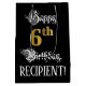 Den här finare och den opassande presentsäcksdesignen med födelsedagstext visar Lycklig 6e födelsedag och anpassade namn. En del av meddelandet finns i en lyxig text med skript-stil. Det stora antalet "6e" har ett faux/imitation guld-inspirerat utseende mönster. Bakgrunden är svart på färgad. En dylik presentpåse på födelsedagen kan användas när en gåva eller present i firande på någons sjätte födelsedag är ge. [~Z0000560]