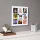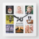 En väggklocka som en gåva till 70-årsdagen för en kille som firar sitt liv med en kollage av 8 av dina egna foton. Mallar för namn, 70 år och ett datum. Födelsedatum eller födelsedatum. Svart färgad brev. Vit bakgrund.