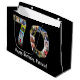 I den övre halvan finns en fotokollage som representerar ett stort nummer 70 gjort av 15 platshållarbilder på en mormor och hennes barn och barnbarn i olika åldrar. Under det finns meddelandet "Grattis på födelsedagen" och namnet i vitt. Bakgrunden är svart.