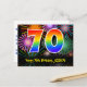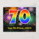 Framsidan av denna spännande, färgglada och roliga födelsedagstema postkortsdesign har en stor siffra "70" med ett regnbågsspektrum-gradering inspirerat mönster, tillsammans med meddelandet "Grattis på 70-årsdagen," och ett redigerbart mottagarnamn. Framsidan har dessutom ett färgglatt och livfullt bakgrundsmönster inspirerat av utseendet på sprängande firande fyrverkerier. Baksidan har ett personligt födelsedagsgratulationsmeddelande, eller kanske kan rensas och lämnas tomt om ett meddelande ska skrivas för hand istället. Ett anpassningsbart födelsedagskort som detta kan vara ett roligt sätt att skicka ett meddelande för att fira någon sjuttioårsdag. Postkort som detta kan också användas för att bjuda in gä