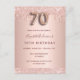 En modern, snyggt och glamorös inbjudan till 70:e födelsedagsfesten. En faux ro guld-metallisk bakgrund tittar med elegant faux guld glitter drop, målardropp. Namn är skrivet med ett modernt skript för färgaden ro guld i mörk, skrivet med stil. Anpassa och lägg till information om party. Nummer 70 är skript med stil som ballong.