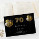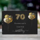 För en elegant på 70 år. En svart bakgrund, dekorerad med ballonger. Nummer 70 är skriven med trendiget ballong stil, leopard mönster. Anpassa och lägg till ett namn och ett datum. Ord-födelsedagen skrivs med ett modernt handskript i stil med dekorationer.