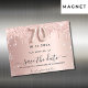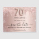 En feminin Spara datumkortet i 70:e födelsedagsfesten. Ro guld övertoningsbakgrund som dekoreras med dropparna ro guld och silver glitter. Anpassa och lägg till datum och namn/text. Texten: Spara datumet skrivs med ett stort trendig-handskript i stil med dekortecken. Nummer 70 med ett stil-teckensnitt med ballong.