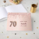 En gästbok för en girig och glamorös 70:e födelsedagsfest. Ett faux ro guld-bakgrund med ro guld, rosa droppar, färgdroppstift. Anpassa och lägg till namn och datum. Namn är skrivet i mörk ro guld med ett modernt handskript i stil. Nummer 70 skrivs med ett stil-teckensnitt med ballong.
