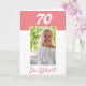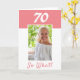 70-årsfirande anpassad gratulationskort för en kvinna som firar 70-årsdagen. Den kommer med ett roligt och motiverande citat 70 Så vad! och är perfekt för en person med humor. Kortet är i rosa och vita färger. Infoga ditt foto i mallen. Du kan också ändra årtalet.