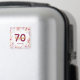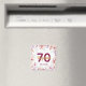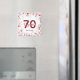 En magnet för en girlaktig 70-årsfest, som en souvenir eller påminnelse om datum för dina gäster. Grenar med rosa, lila och gyllene magnoliablommor. Elegant vit bakgrund. Mallar för namn, ålder 70 och datum. Födelsedatum eller datum för festen/årsdagen. Gyllene och vinröda bokstäver. Namnet skrivs med en modern handskriven stil.