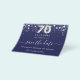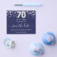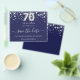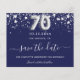 Observera att det här Spara datumet är pappert och mycket tunt. Kuvert ingår inte. Om du vill ha ett tjockare Spara datumkortet (samma design) kan du besöka vår butik. Ett giftigt och trendig Spara datum för en 70:e födelsedagsfest. En marin blå färgad bakgrund. Dekorerad med faux silver-stjärnor. Texten: Spara datumet skrivs med ett stort trendig-handskript i stil. Nummer 70 skrivs med ett stil-teckensnitt med ballong.