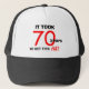 Denna underbara 70-årsdagars gåva för manar är en hatt för honom till bära med pridet. Hatten säger: "Det tog 70 år att få den här hatten." Det är en lustig hatt för en man med en bra känsla av humor. Det är också perfekt för alla som behöver födelsedagspresent för 70-årsjubileum. Copyright Kathy Henis