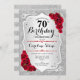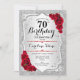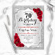 70:e födelsedagsinbjudan. Utformning av blommigt i elegant i silver och rött. Funktioner faux glitter silver rand, röd ros snyggt, skriptteckensnitt och konetti. Perfekt för en glam-födelsedagsfest.