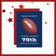 En fotboll på mörk blått bakgrund dekorerar detta unika och roligt 70 Födelsedagsfest inbjudan. Baksidan har vit text på röd bakgrund. Du kan enkelt ändra texten för namn, ålder, händelse, datum osv. Fotbollsspelare, fläkt och bussar kommer att kärlek det! Alla Höger förbehållna © 2015 Alan & Marcia Socolik.