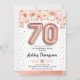 70 födelsedagsfest inbjudan. Elegantens utformning i Faux glitter ro guld med blommigt accent. Inbjudan-kort med ro guld nummer 70 ballonger, skriptteckensnitt med konetti. rosa, vit. Perfekt för en snyggt 70-bitars firande. Berätta om du behöver anpassningsbarnas ålder.