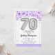 70 födelsedagsfest inbjudan. Elegantens utformning i faux glitter silver med blommigt accent. Inbjudan-kort med silver nummer 70 ballonger, skriptteckensnitt med konetti. Pastel lila, lavender och vit. Perfekt för en snyggt 70-bitars firande. Berätta om du behöver anpassningsbarnas ålder.