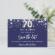 En elegant Spara datumkortet för en 70:e födelsedagsfest. En marin blå dekorerad med stjärnor. Anpassa och lägg till datum och namn/ålder. Texten: Spara datumet skrivs med ett stort trendig-handskript i stil.