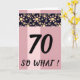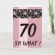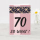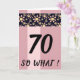 70 Så Vad Rolig Rosa Blommig Födelsedagskort för Henne. Kortet är rosa med en rand av rosa och gula blommönster på svart bakgrund. Roligt och inspirerande citat 70 så vad är perfekt för en person med humor. Ändra åldern och anpassa meddelandet och namnen inuti eller ta bort det.