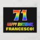 Framsidan av denna färgstarka, roligt- och glansfulla vykortsdesign på födelsedagen innehåller ett stort nummer "71" och meddelandet "GRATTIS PÅ FÖDELSEDAGEN", som båda har en regnbågsspektrumövertoning som inspirerade mönster-färgning, tillsammans med en fet gult anpassade mottagare namn. På framsidan finns också en enkel bakgrund för svart färgad. Baksidan av vykortet innehåller ett hälsning-meddelande från anpassningsbarnas födelsedag, eller så kan det kanske rensas och lämnas tomt om ett meddelande ska skrivas för hand i stället. Ett sådant här muntert vykort för anpassadets födelsedag kan vara ett roligt för att fira någons sjuttioårsdag. [~Z0000474]