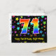 Framsidan av denna roliga, spännande och färgglada födelsedagskortdesign har en stor siffra "71" med ett regnbågsspektrum-graderingmönster. Den har också texten "Grattis på 71-årsdagen" och ett anpassat mottagarnamn. Framsidan har dessutom en färgrik och livfull bakgrund med ett mönster av stjärnformer. Baksidan har ett anpassat födelsedagsgratulationsmeddelande, eller kan kanske rensas och lämnas tomt om ett meddelande ska skrivas för hand istället. Ett personligt födelsedagskort som detta kan vara ett roligt sätt att erkänna någon på deras sjuttioförsta födelsedag. Postkort som detta kan också användas för att bjuda in gäster till en födelsedagsfest som hålls för någon som fyller