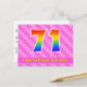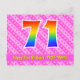 Framsidan av denna roliga, glada och uppiggande födelsedagstemanpassade vykort visar ett stort nummer "71" med ett regnbågsspektrum-gradering inspirerat mönster, tillsammans med meddelandet "Grattis på 71-årsdagen," och en personlig mottagares namn. Framsidan har dessutom ett glatt ljust rosa och mörkt rosa randigt mönster med hjärtformer. Baksidan har ett anpassat födelsedagsmeddelande, eller skulle kunna rensas och lämnas tom om ett meddelande ska skrivas för hand istället. Ett personligt födelsedagsvykort som detta kan vara ett roligt sätt att skicka ett meddelande för att fira någon:s sjuttioförsta födelsedag. Vykort som detta kan också användas för att inbjuda gäster till en födelsedagsfest eller kalas som