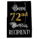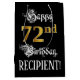 Den här utformandet och eleganten av presentsäcksdesignen innehåller budskapet "Lycklig 72:a födelsedagen", tillsammans med en redigerbar mottagare namn. En del av meddelandet finns i ett ordat skript-stil. Det stora antalet "72:a" har ett faux/imitation guld-inspirerat utseende mönster. Bakgrunden är svart på färgad. En sådan här presentpåse på en finare-födelsedag kan vara ett respektabelt sätt att figurera en gåva eller gåva som ges till någon som firar sin 72-årsdag. [~Z0000560]