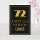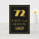 Denna vintage/retro-stil och inspirerad av det glada 1920-talet födelsedagstemat gratulationskortdesign har ett stort Art déco- utseende inspirerat nummer "72", meddelandet "GRATTIS PÅ 72-ÅRSDAGEN", ett redigerbart namn och ett kantmönster bestående av tunna linjer på framsidan. Framsidan har en svart bakgrund. Insidan har ett redigerbart födelsedagsmeddelande, eller skulle kunna tömmas och lämnas tom om ett meddelande ska skrivas för hand istället. Ett anpassat födelsedagsgratulationskort som detta kan skickas för att fira någons sjuttiotvåårsdag.