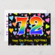 Den främre delen av denna kärleksfulla, färgglada och spännande födelsedagskortdesign har en stor siffra "72" med ett regnbågsspektrum-gradering-mönster, tillsammans med meddelandet "Grattis på 72-årsdagen," och ett redigerbart mottagarnamn. Framsidan har dessutom en livlig och färgrik bakgrund med ett mönster av kärleksfulla hjärtan. Baksidan har ett anpassat födelsedagsmeddelande, eller kan raderas och lämnas tomt om ett meddelande ska skrivas för hand istället. Ett anpassningsbart födelsedagskort som detta kan vara ett roligt sätt att skicka ett meddelande för att fira någon som fyller 72 år. Postkort som detta kan också användas för att inbjuda gäster till en födelsedagsfest som hålls för