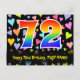 Framsidan av denna kärleksfulla, färgglada och spännande födelsedagskortdesign har en stor siffra "72" med ett regnbågsspektrum-gradering-mönster, tillsammans med meddelandet "Grattis på 72-årsdagen," och ett redigerbart mottagarnamn. Framsidan har dessutom en livfull och färgrik bakgrund med ett mönster av kärleksfulla hjärtan. Baksidan har ett anpassat födelsedagsmeddelande, eller skulle kunna tömmas och lämnas tom om ett meddelande ska skrivas för hand istället. Ett anpassningsbart födelsedagskort som detta kan vara ett roligt sätt att skicka ett meddelande för att fira någon som fyller sjuttiotvå år. Postkort som detta kan också användas för att inbjuda gäster till en födelsedagsfest som