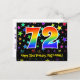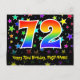 Framsidan av denna spännande, färgglada och roliga födelsedagsteman postkortsdesign har en stor siffra "72" med ett regnbågsspektrum-gradering inspirerat mönster, tillsammans med meddelandet "Grattis på 72-årsdagen", och ett redigerbart mottagarnamn. Framsidan har dessutom ett livfullt och färgglatt stjärnformigt bakgrundsmönster. Baksidan har ett anpassningsbart födelsedagsmeddelande, eller skulle kunna rensas och lämnas tom om ett meddelande ska skrivas för hand istället. Ett personligt födelsedagskort som detta kan vara ett roligt sätt att skicka ett meddelande för att fira någon som fyller sjuttiotvå. Postkort som detta kan också användas för att bjuda in gäster till en födelsedagsfest eller firande