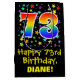 Den här färgstarka, spännande och roligt-matade presentsäcksdesignen har ett stort nummer "73" med en regnbågsspektralgradient som inspirerade mönster, tillsammans med meddelandet "Lycklig 73:e födelsedagen", och en anpassade som tar emot namn. Den har också en färgstark bakgrund i mönster med stjärnformer av olika storlek. En dylik presentpåse på födelsedagen kan användas när en gåva eller present i firande på någons 73-årsdag är ge. [~Z0000510]