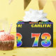 Den här roligten, som är färgstark och glad och som fyller år, har en papper design med ett stort nummer "73" och meddelandet "GRATTIS PÅ FÖDELSEDAGEN", som båda har en regnbågsspektrumövertoning som inspirerar mönster, tillsammans med en fetstilt gult som kan redigeras av namn. Bakgrunden är svart på färgad. Roligt som är papper som denna kan användas när en gåva eller present är ge för att hedra någons 73-årsdag. [~Z0000475]