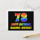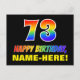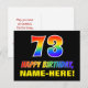 Framsidan av denna färgstarka, roligt- och glansfulla vykortsdesign på födelsedagen innehåller ett stort nummer "73" och meddelandet "GRATTIS PÅ FÖDELSEDAGEN", som båda har en regnbågsspektrumövertoning som inspirerade mönster-färgning, tillsammans med en fet gult anpassningsbar mottagare namn. På framsidan finns också en vanlig, enkel, svart färgad. Baksidan av vykortet innehåller ett hälsning-meddelande från anpassadets födelsedag, eller så kan det kanske rensas och lämnas tomt om ett meddelande ska skrivas för hand i stället. Ett så pass dynamiskt vykort för anpassadets födelsedag kan vara ett roligt för att erkänna någons sjuttiotredje födelsedag. [~Z0000474]
