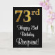 Den här snyggten, den sofistikerade och lyxiga hälsningskortet med födelsetal har ett stort ordnummer "73:e" som har ett faux/imitation guld-liknande utseende, tillsammans med hälsning-födelsedagsmeddelandet "Lycklig 73:e födelsedagen" och en personlig namn i ett skript-stil-teckensnitt på framsidan. Bakgrunden till framsidan är svart färgad. Insidan har ett hälsning-meddelande på anpassningsbarnas födelsedag, eller kan kanske tas bort och lämnas tomt om ett meddelande ska skrivas för hand i stället. Ett sofistikerat, anpassat födelsedagskalenligationskort som detta kan skickas i firande på någons sjuttiotredje födelsedag. [~Z0000518]