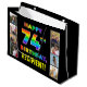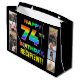Den här presentsäcksdesignen för öga-infångning och uppslag på födelsedagskalemat innehåller meddelandet "LYCKLIG 74:e BIRTHDAY", där texten har ett flerfärgat regnbågsspektrum som inspirerar gradienten mönster, tillsammans med en anpassningsbar mottagare namn. Fotografierna till lämnat och högerna av det regnbågsmönstrade meddelandet på kortets framsida kan vara personlig, kanske med foton av mottagaren, mottagarens familj och vänner och/eller presentens avsändare. En dylik födelsedagsäck kan vara ett roligt för att slå ihop en gåva som ges till någon som firar sin sjuttiofjärde födelsedag. (Photography © Storytree Studios, Stanford, CA.) [~Z0000668]
