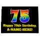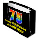 Denna färgrika och livfulla presentförpackning för födelsedagsfirande har en stor siffra "75" med ett mönster inspirerat av regnbågens färgspektrum, tillsammans med meddelandet "Grattis på 75-årsdagen" och ett redigerbart namn. Den har också en svart bakgrund. En rolig presentförpackning som denna kan vara ett roligt sätt att förpacka en födelsedagspresent eller en gåva som ges till någon som firar sin 75-årsdag.