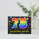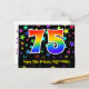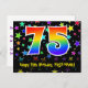 Framsidan av denna spännande, färgglada och roliga födelsedagskortdesign har en stor siffra "75" med ett regnbågsspektrum-gradering-mönster. Den har också meddelandet "Grattis på 75-årsdagen" och ett anpassat mottagarnamn. Framsidan har dessutom en färgrik och livfull bakgrund med ett mönster av stjärnformer. Baksidan har ett anpassningsbart födelsedagsmeddelande, eller kanske kan rensas och lämnas tomt om ett meddelande ska skrivas för hand istället. Ett anpassningsbart födelsedagskort som detta kan vara ett roligt sätt att erkänna någon på deras sjuttiofemårsdag. Postkort som detta kan också användas för att bjuda in gäster till en födelsedagsfest eller firande som hålls för någon som fyller