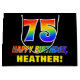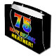 Den här roligten, den roliga och färglösa presentväskan med födelsedagstext har ett stort nummer "75" och meddelandet "GRATTIS PÅ FÖDELSEDAGEN,", som båda har en regnbågsspektrumövertoning som inspirerade mönster-färgning, tillsammans med en fetstilt gult redigerbar mottagare namn. Bakgrunden är svart på färgad. En roligt presentsäck av det här slaget kan användas när man slår in gåvor som ges till någon i firande på deras sjuttiofemårsdag. [~Z0000477]