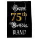 Den här utformandet och elegantens presentsäcksdesign för födelsedagspressar innehåller meddelandet "Lycklig 75:e födelsedag", tillsammans med anpassadets mottagare namn. En del av budskapet finns i en lyxig text med skript-stil. Det stora antalet "75:e" har ett faux/imitation guld-inspirerat utseende mönster. Bakgrunden är svart på färgad. En presentpåse som denna kan användas när en gåva eller present till heder för någons födelsedag i 75:e är ge. [~Z0000560]