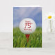 Slut upp av en vitgolfboll på en röd utslagsplats i gräs med himmelbakgrund för 75:efödelsedag.