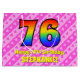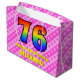 Den roliga och 76:e lycklig-födelsedagsmatade presentväskan har ett stort nummer "76" med ett mönster inspirerat av ett regnbågsspektrum. Det innehåller också budskapet "Lycklig 76:e födelsedag" och personlig namn. Bakgrunden har en rosa i mörk och ett mönster i ljusa rosa rand som innehåller levande hjärtformer i rosa. Sådana presentsäckar kan användas när presenter eller presenter förpackas för att hedra någons sjuttiosjätte födelsedag. [~Z0000414]