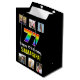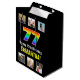 Denna glada och iögonfallande födelsedagstematiska presentpåsdesign har en stor siffra "77" med ett livfullt regnbågsspektrum-inspirerat gradientmönster, tillsammans med meddelandet "Happy 77th Birthday", och en personlig mottagares namn. Ovanför och under meddelandet finns några foton som kan anpassas, kanske med bilder på mottagaren, mottagarens familj och vänner och/eller givaren/ givarna av gåvan. En iögonfallande presentpåse som denna kan vara ett roligt sätt att förpacka en födelsedagspresent eller gåva som ges till någon som firar sin sjuttiosjunde födelsedag. (Fotografi © Storytree Studios, Stanford, CA.) [~Z0000669]