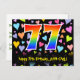 Framsidan av denna kärleksfulla, roliga och spännande födelsedagskortdesign har en stor siffra "77" med ett regnbågsspektrum-gradering-mönster, tillsammans med meddelandet "Grattis på 77-årsdagen," och ett anpassningsbart mottagarnamn. Framsidan har dessutom en livfull och färgrik bakgrund med ett mönster av kärleksfulla hjärtan. Baksidan har ett personligt födelsedagsmeddelande, eller kan kanske rensas och lämnas tom om ett meddelande ska skrivas för hand istället. Ett personligt födelsedagskort som detta kan vara ett roligt sätt att skicka ett meddelande för att fira någon som fyller sjuttiosju år. Postkort som detta kan också användas för att inbjuda gäster till en födelsedagsfest som hålls för någon som