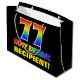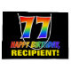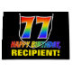 Den här roliga, roligt- och färgstarka presentväskan har ett stort nummer "77" och meddelandet "GRATTIS PÅ FÖDELSEDAGEN", som båda har en regnbågsspektrumövertoning som inspirerade mönster-färgning, tillsammans med en fet gult personlig-mottagare namn. Bakgrunden är svart på färgad. En roligt presentsäck av det här slaget kan användas när man slår in presenter som ges till någon i firande på 70-årsdagen. [~Z0000477]