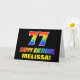 På framsidan av denna glada, färgstarka och roligt födelsedag med hälsningskortet finns ett stort nummer "77" och meddelandet "GRATTIS PÅ FÖDELSEDAGEN,", som båda har en regnbågsspektrumövertoning som inspirerade mönster-färgning, tillsammans med en fet gult anpassningsbar mottagare namn. På framsidan finns också en minsta bakgrund för svart färgad. Insidan innehåller ett hälsning-meddelande från anpassadets födelsedag, eller kan kanske tas bort och lämnas tomt om ett meddelande ska skrivas för hand i stället. Ett färgstarkt personlig-födelsedagskort som detta kan vara ett roligt sätt att skicka ett meddelande i firande om någons sjuttiosjunde födelsedag. [~Z0000472]
