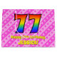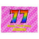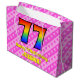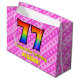 Den här roligten och den 77:e födelsedagskalematerade presentsäcksdesignen har ett stort nummer "77" med ett regnbågsspektrum som inspirerar till gradient mönster. Det innehåller också budskapet "Lycklig 77:e födelsedag" och ett redigerbart namn. Bakgrunden är en glad mönster av ljust rosa och mörk rosa rand som innehåller levande hjärtan i rosa. En presentpåse som denna kan användas när man slår in gåvor eller presenter som ges till minne av någons sjuttiosjunde födelsedag. [~Z0000414]