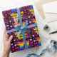 This joyful and fun birthday wrapping paper design features a large number “77” having a rainbow spectrum gradient inspired pattern. It also features the message “Happy 77th Birthday,”, and a personalized name. The background features a pattern of pink, red, and purple heart shapes of various sizes. Wrapping paper like this might be used when wrapping gifts being given to somebody in celebration of their 77th birthday. [~Z0000549]