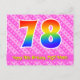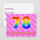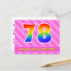 Framsidan av denna glada och roliga födelsedagskortdesign har en stor siffra "78" med ett regnbågsspektrum-gradering inspirerat mönster, tillsammans med meddelandet "Grattis på 78-årsdagen," och ett anpassningsbart mottagarnamn. Framsidan har dessutom ett glatt ljust rosa och mörkt rosa randigt mönster med hjärtformer. Baksidan har ett anpassat födelsedagsmeddelande, eller kanske kan tömmas och lämnas tom om ett meddelande ska skrivas för hand istället. Ett anpassningsbart födelsedagskort som detta kan vara ett roligt sätt att skicka ett meddelande för att fira någon som fyller sjuttiåtta år. Postkort som detta kan också användas för att inbjuda gäster till en födelsedagsfest som hålls för någon som fyller 78