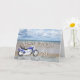 En blå motorcykel som står på en strand med flytande moln i himlar. Grattis på födelsedagen skrivet i sten och speglat i vatten ljugande på sand.