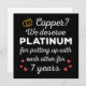 Utformning av roligten, perfekt för alla som varit gifta i sju år och till en förnyelseceremoni i bröllop. Det gör en underbar matchningsutrustning för par! Koppar? Vi förtjänar Platinum för att ha stått ut med varandra i sju års citat för ett par som har gifte sig för sju år sedan eller ett par som förnyar bröllop på sin kopparårsdag. Är du en romantisk make eller fru? Förstärka stil med den här konsten! Underbar gåva till din vän som har gifte sig med för 7 år sedan, make eller hustru för 7 år sedan, eller pappa och mamma för att fira deras bröllop-årsdag i 7:e.