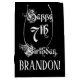 Den här presentsäcksdesignen i finare och den högtidliga födelsedagstäcken innehåller meddelandet "Lycklig 7:e födelsedag" i opulent text med stil, på en svart färgad. Det har också en anpassningsbar som tar emot namn. En sådan här lavish födelsedagsäck kan användas när en gåva eller present i firande på någons 7:e födelsedag är ge. [~Z0000557]