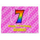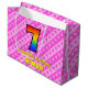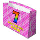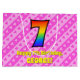 Den här festliga och glada 7:e-födelsedagskalendern med presentväskan har ett stort nummer "7" med ett mönster inspirerat av ett regnbågsspektrum. Det innehåller också budskapet "Lycklig 7:e födelsedag", följt av anpassadet namn. Bakgrunden är en roligt mönster av ljus rosa och mörk rosa rand som innehåller levande hjärtan i rosa. En presentpåse som denna kan användas när man slår in presenter eller gåvor som ges till heder för någons sjunde födelsedag. [~Z0000414]