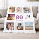 En gåva till en kvinnas 80-årsdag som firar hennes liv med en kollage av 8 av dina foton. Mallar för namn, 80 år och ett datum. Födelsedatum eller födelsedatum. Rosa och lila färgad brev. Vit färgad bakgrund.